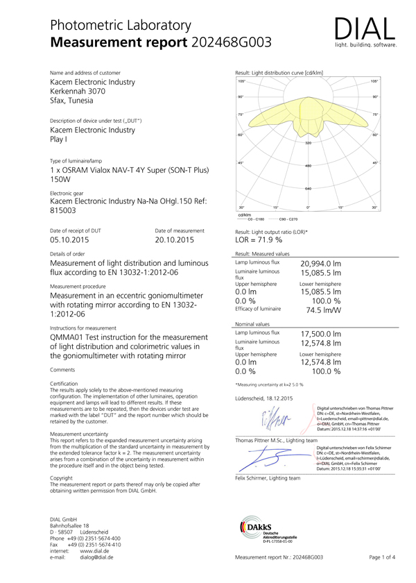 Rapport d'essai pour luminaire d'éclairage public Play I