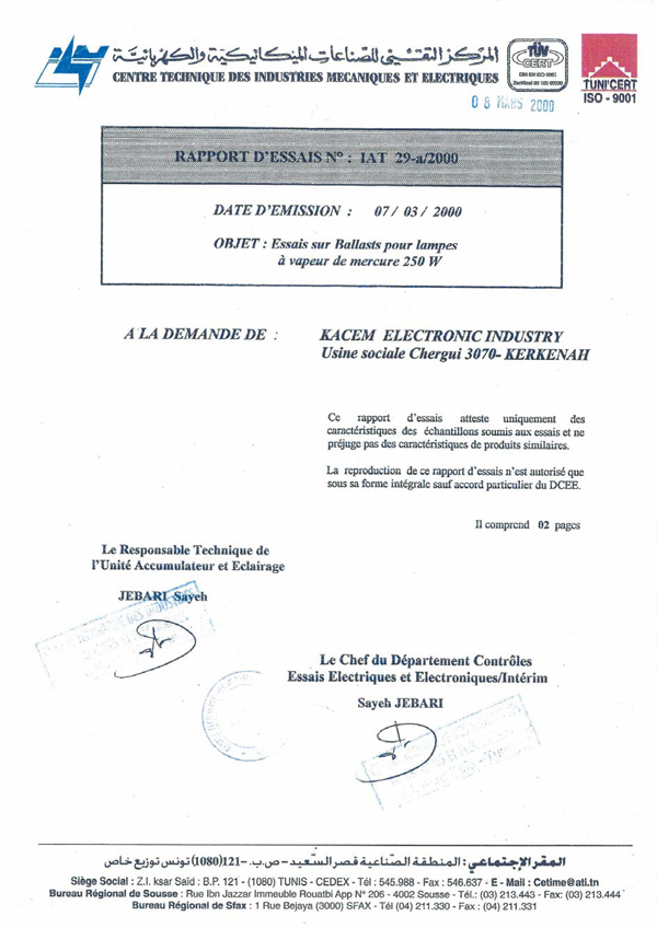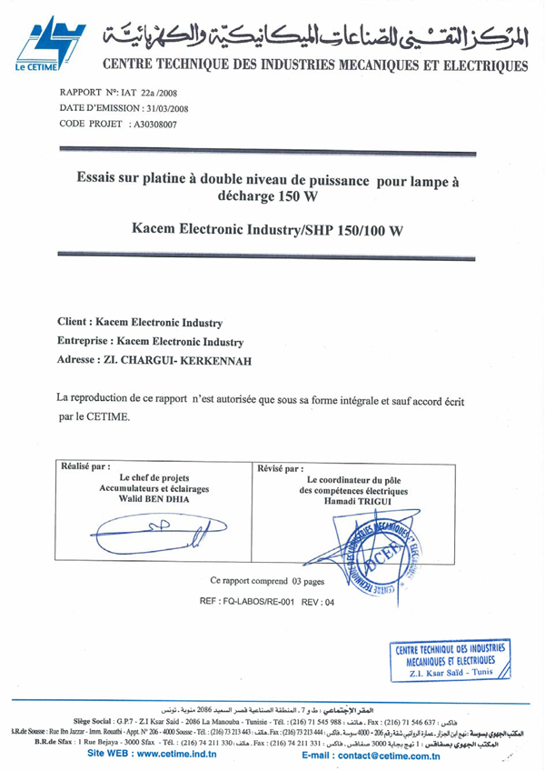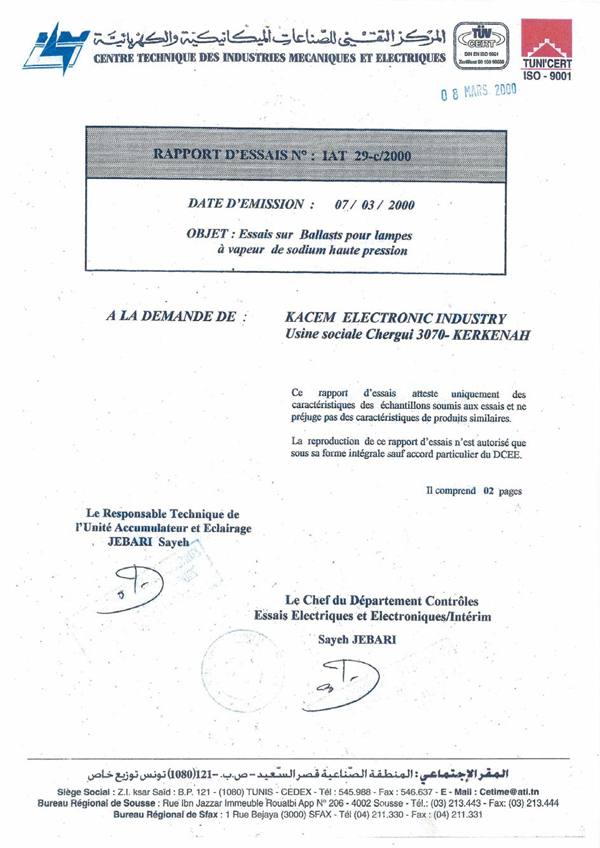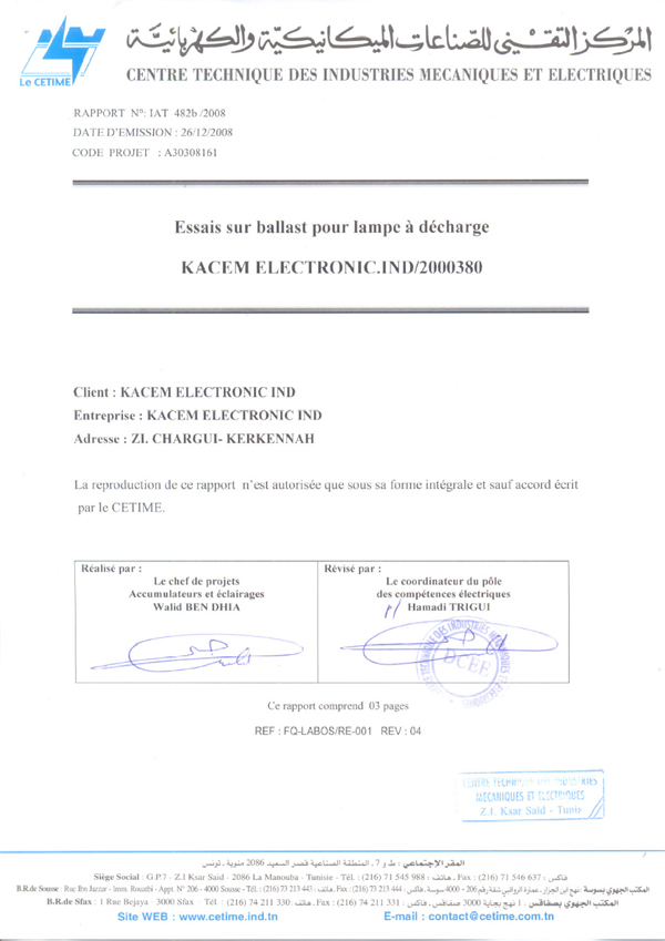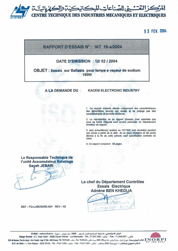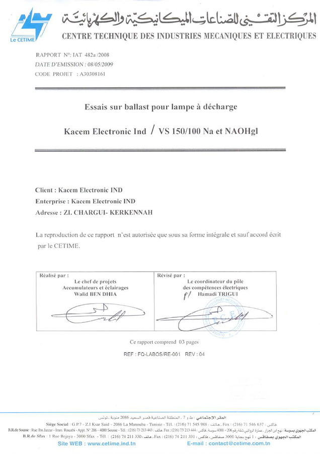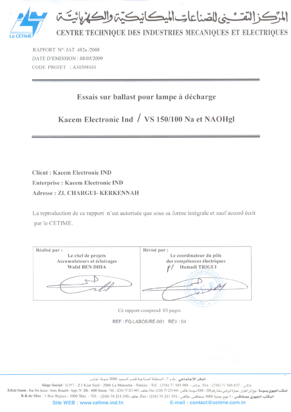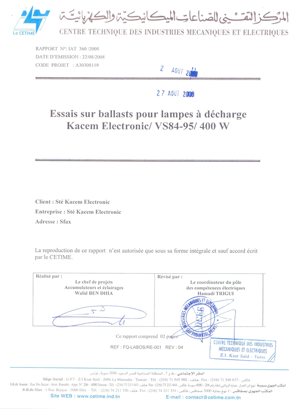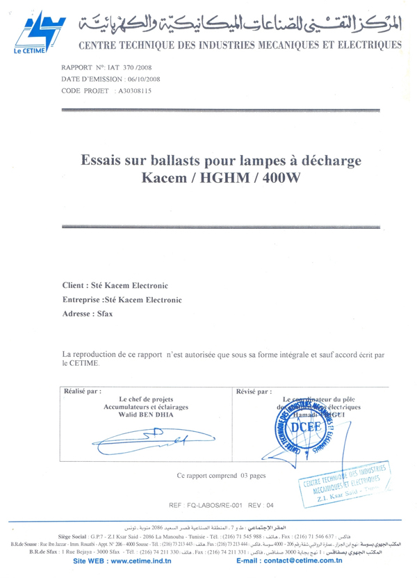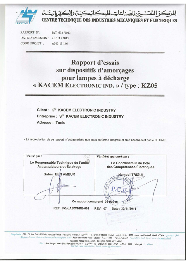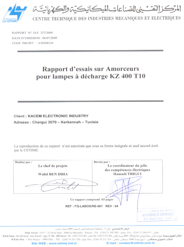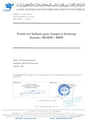 Rapport d'essais sur Amorceurs pour lampes à décharge KZ 400 T10