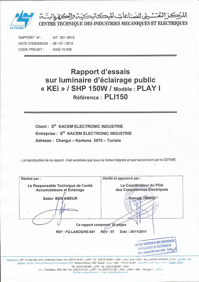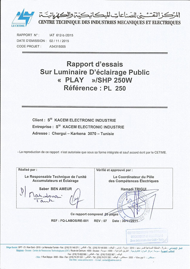 Rapport d'essai pour luminaire d'éclairage public Play