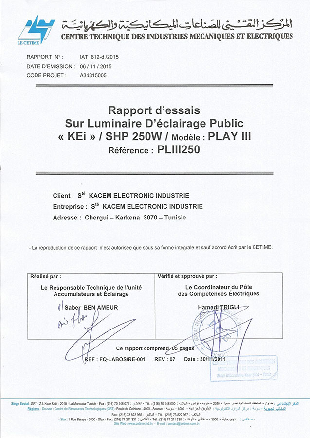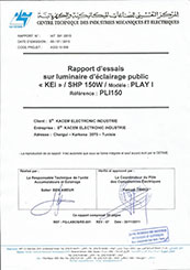 Rapport d'essai pour luminaire d'éclairage public Play III