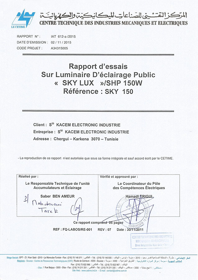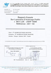 Rapport d'essai pour luminaire d'éclairage public Skylux